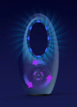 Moltiplicatore d’aria bladeless, senza pale. Velocità d’aria di 4,3 metri al secondo, superiore a quella di un ventilatore da tavolo di 40 cm di diametro. Luce notturna LED a 4 colori. Timer 7,5 ore, telecomando. Comandi touch, oscillante. Un elemento di design, sicuro, efficiente e facile da utilizzare.