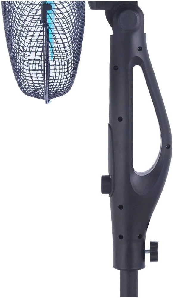 Ventilatore a piantana Ø 40 cm, pale colorate in semitrasparenza turchese ad alta velocità , griglia a nido d’ape, oscillazione laterale automatica. Inclinazione verticale manuale. 3 velocità , base tonda, look total black con tubo in metallo brunito. Design Premium elegante e raffinato.