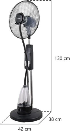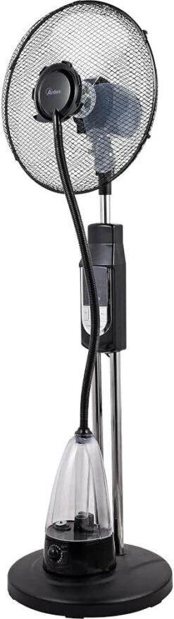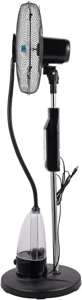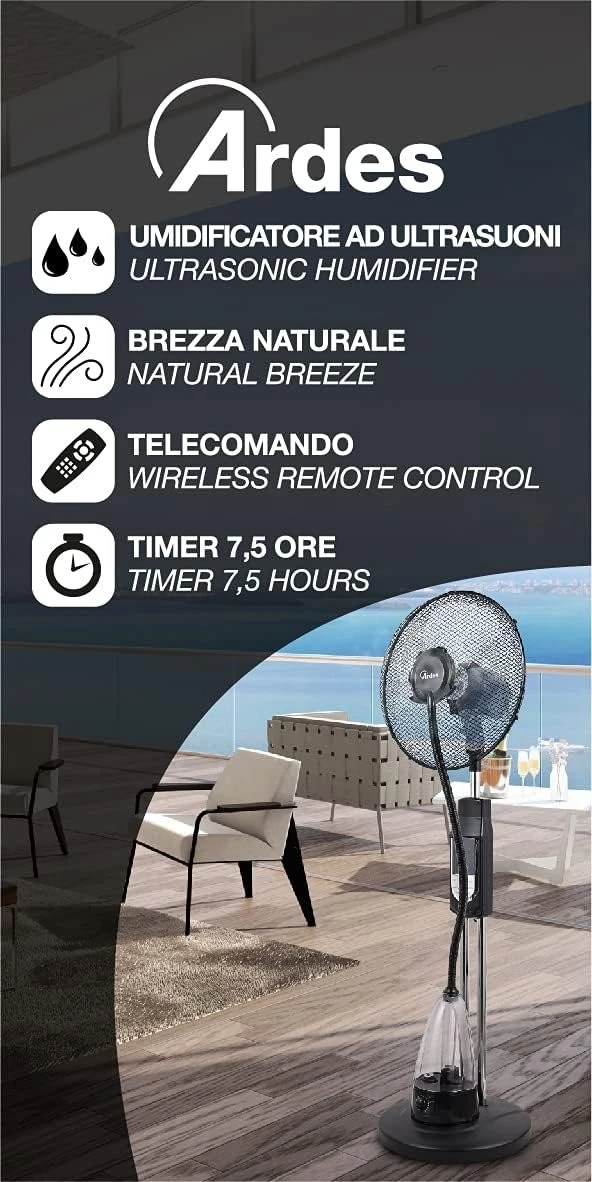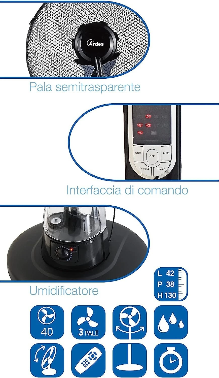 Ventilatore a piantana ø 40 cm. 3 velocità . Base tonda. Funzione brezza naturale e notturna. Umidificatore ad ultrasuoni. Oscillazione laterale automatica. Timer 7,5 ore. Telecomando.