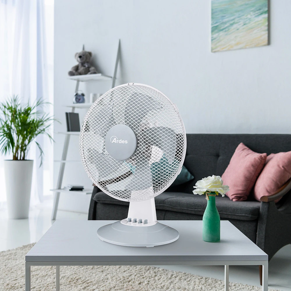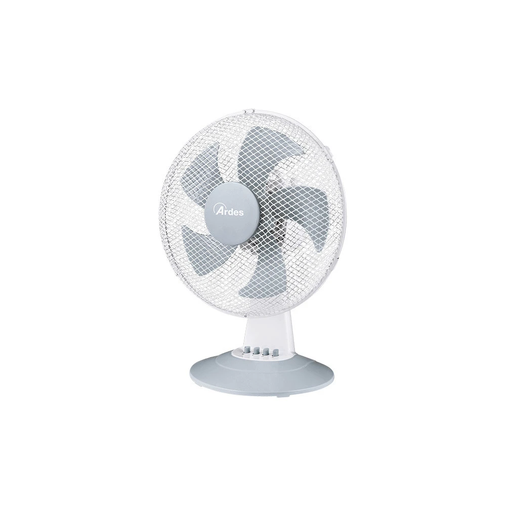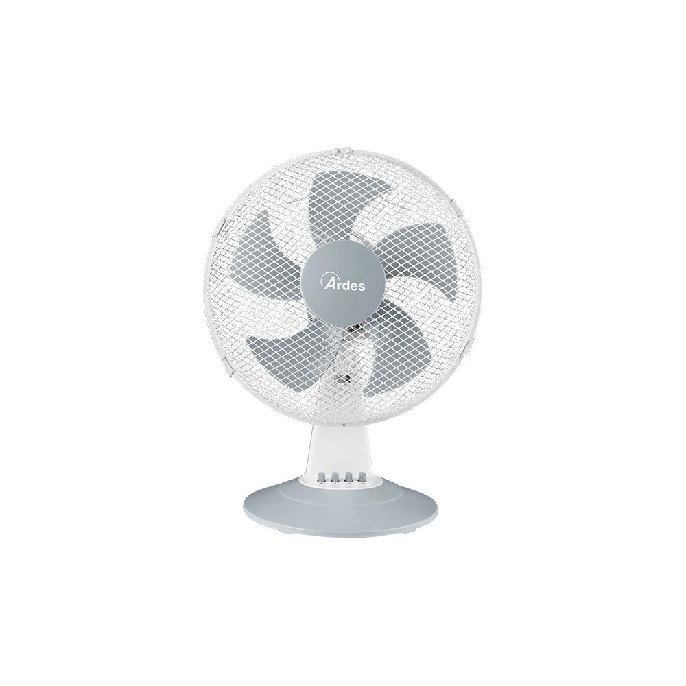Ardes AR5ST30W. Tipo: Ventilatore domestico con pale, Colore del prodotto: Bianco, Installazione: Tavolo. Tipologia alimentazione: AC, Consumi: 30 W, Tensione di ingresso AC: 220 – 240 V. Larghezza: 360 mm, Profondità : 260 mm, Altezza: 470 mm. Larghezza imballo: 385 mm, Profondità imballo: 105 mm, Altezza imballo: 466 mm