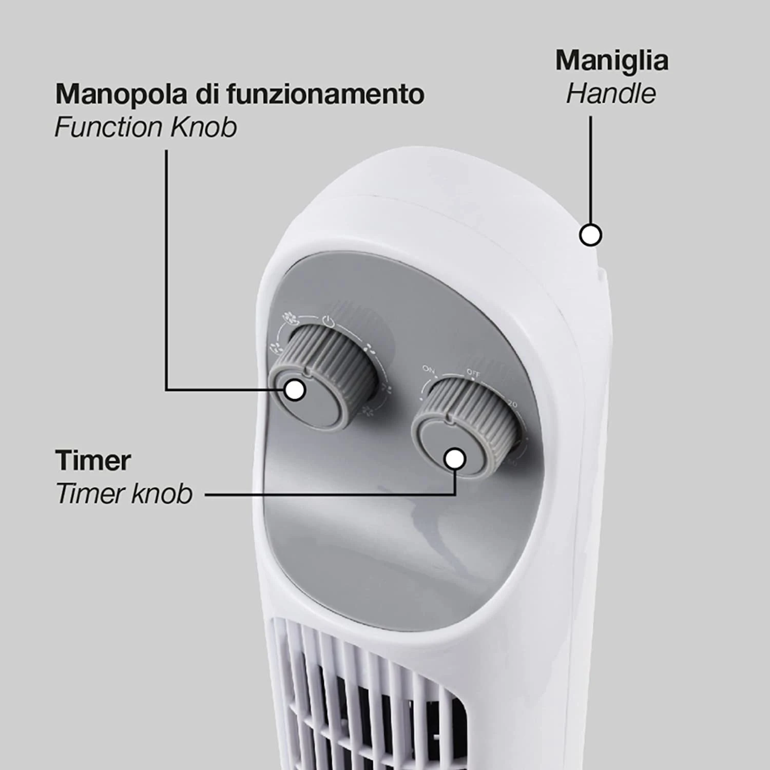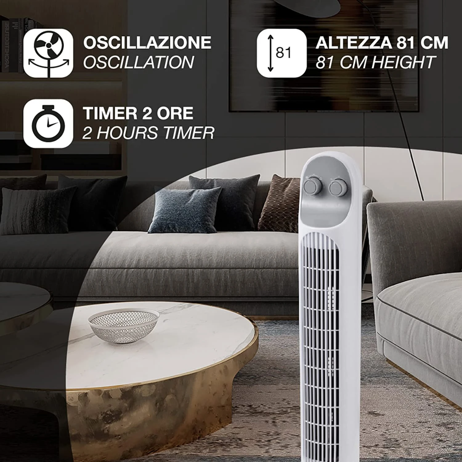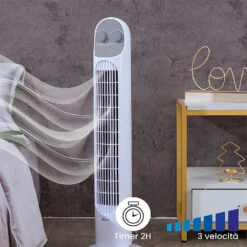 Ventilatore a torre, con comandi manuali. Altezza 81 cm. 3 velocità . Timer 120 minuti. Oscillazione laterale automatica. Finitura bianca.
