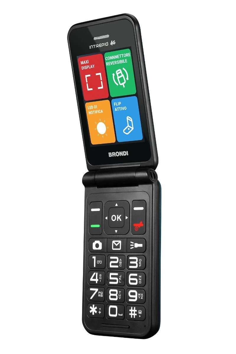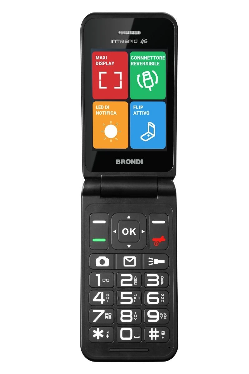 Brondi Intrepid 4G. Fattore di forma: Clamshell. Capacità della scheda SIM: Doppia SIM. Dimensioni schermo: 7,11 cm (2.8″), Risoluzione del display: 240 x 320 Pixel. Risoluzione fotocamera posteriore (numerico): 2 MP. Bluetooth. Tecnologia batteria: Ioni di Litio, Capacità della batteria: 1000 mAh, Autonomia in standby (2G): 170 h. Colore del prodotto: Verde
