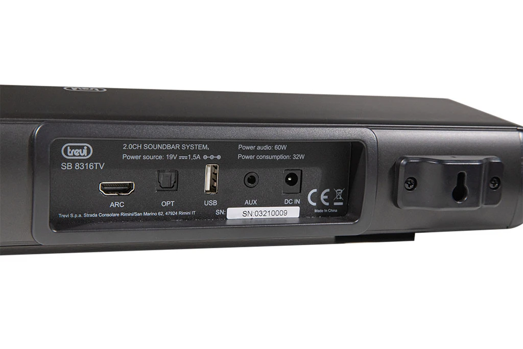 Trevi SB 8312 TV. Sistema audio: 2.0 canali, Potenza in uscita (RMS): 30 W. Potenza RMS dell’altoparlante soundbar: 30 W. Colore del prodotto: Nero. Tecnologia di connessione: Con cavo e senza cavo, Versione Bluetooth: 5.0+EDR, Tipi schede di memoria: MicroSD (TransFlash). Tensione di ingresso AC: 110-240 V, Frequenza di ingresso AC: 50/60 Hz, Consumi: 29 W