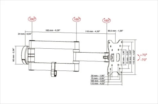 Munari SP367. Peso massimo (capacità ): 15 kg, Capienza minima dimensioni dello schermo: 43,2 cm (17″), Capienza massima dimensioni dello schermo: 66 cm (26″), Compatibilità interfaccia di montaggio (min): 75 x 75 mm, Compatibilità interfaccia di montaggio (max): 100 x 100 mm. Inclinazione: -70 – 70°, Angolo di rotazione: 0 – 180°. Colore del prodotto: Nero