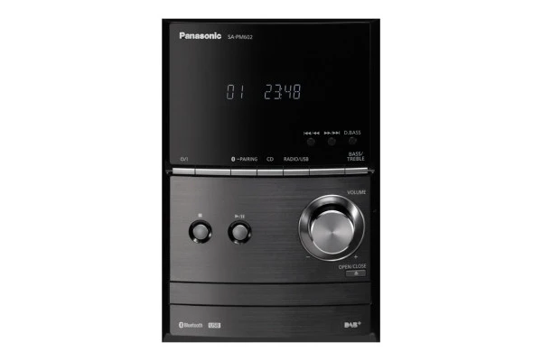 Panasonic SC-PM602EG. Tipo: Microsistema audio per la casa, Colore del prodotto: Nero, Numero di dischi ottici: 1 dischi. Potenza in uscita (RMS): 40 W, Tipo di speaker: 2-vie, Impedenza: 6 Ω. Bande del sintonizzatore: DAB+,FM. Alimentazione: AC, Consumi: 17 W, Consumi (modalità stand-by): 0,6 W. Larghezza: 153 mm, Profondità : 232 mm, Altezza: 224 mm