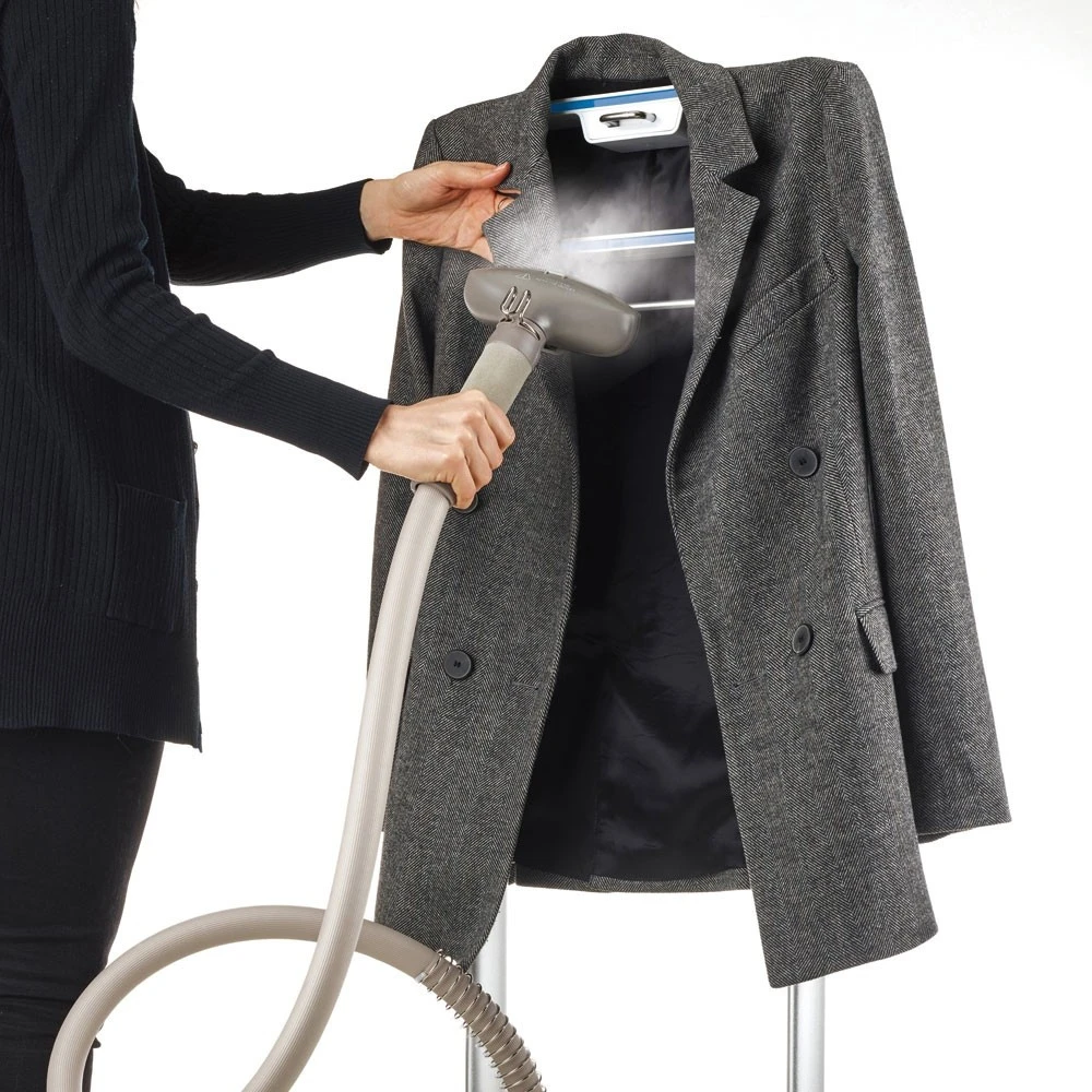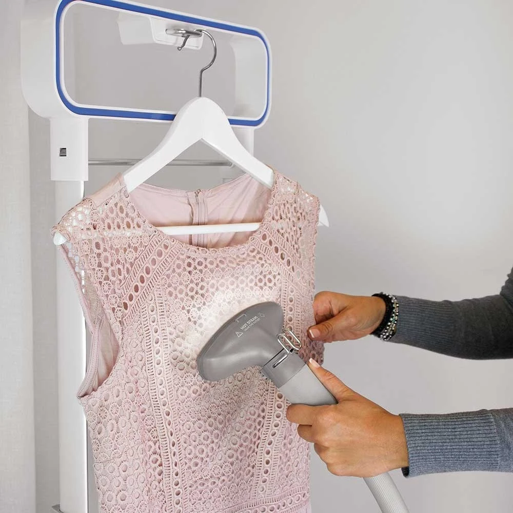 L’appendiabiti regolabile in altezza, multifunzione, consente di trattare comodamente diverse tipologie di capi e di tessuti.