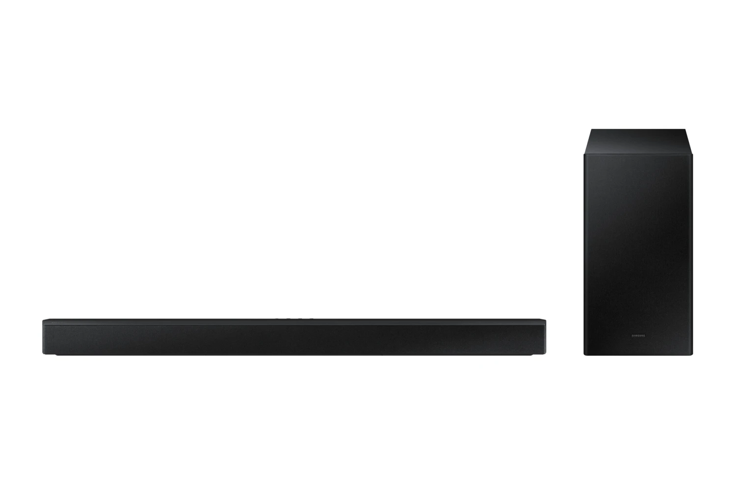 Samsung Soundbar HW-B450/ZF con subwoofer 2.1 canali 300W 2022, bassi profondi, effetto surround, suone ottimizzato, unico telecomando. Sistema audio: 2.1 canali, Potenza in uscita (RMS): 300 W, Formato audio integrato: Dolby Atmos. Colore del prodotto: Nero, Formati audio supportati: AAC,AIFF,FLAC,MP3,OGG,WAV. Tecnologia di connessione: Con cavo e senza cavo, Codec Bluetooth: SBC, AAC. Consumo energetico del soundbar: 25 W, Consumo subwoofer: 40 W, Consumi (modalità stand-by): 0,5 W. peso soundbar: 1,4 kg, Larghezza subwoofer: 85,9 cm, Profondità subwoofer: 29,5 cm