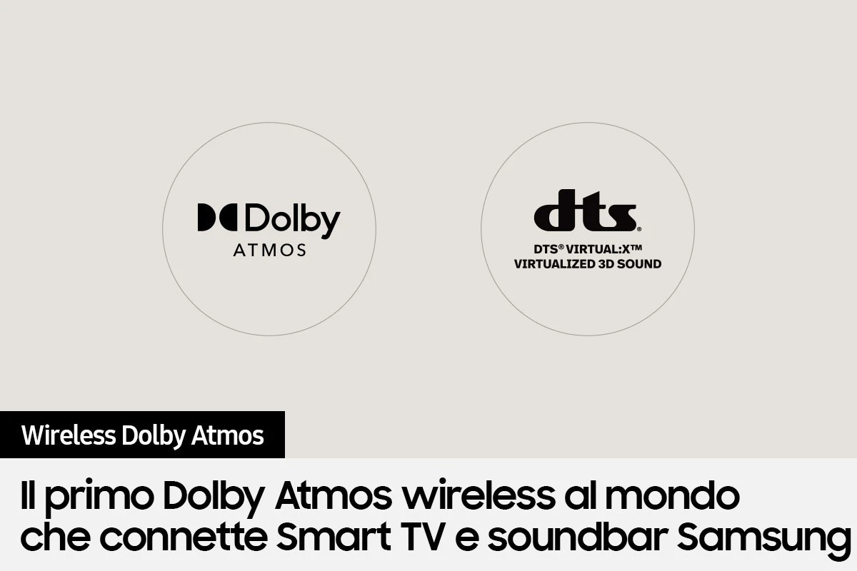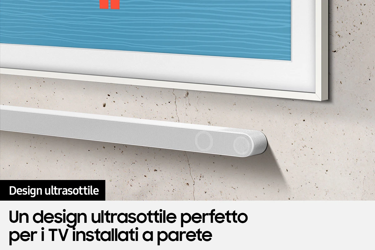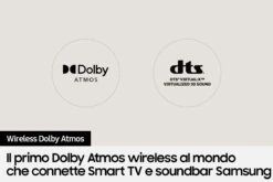 Samsung Soundbar HW-S801B/ZF con subwoofer e speaker 3.1.2 canali 330W 2022, audio 3D wireless ottimizzato, effetto cinema surround. Sistema audio: 3.1.2 canali, Formato audio integrato: DTS Virtual:X, Dolby Atmos, Dolby Digital Plus. Connettività del subwoofer: Wireless, Posizione del subwoofer: Separato. Colore del prodotto: Bianco, Formati audio supportati: MP3, AAC, WAV, OGG, AIFF, ALAC, FLAC, Assistente virtuale: Amazon Alexa & Google Assistant. Tecnologia di connessione: Con cavo e senza cavo, Codec Bluetooth: SBC. Consumo energetico del soundbar: 28 W, Consumo subwoofer: 26 W, Consumi (modalità stand-by): 0,5 W