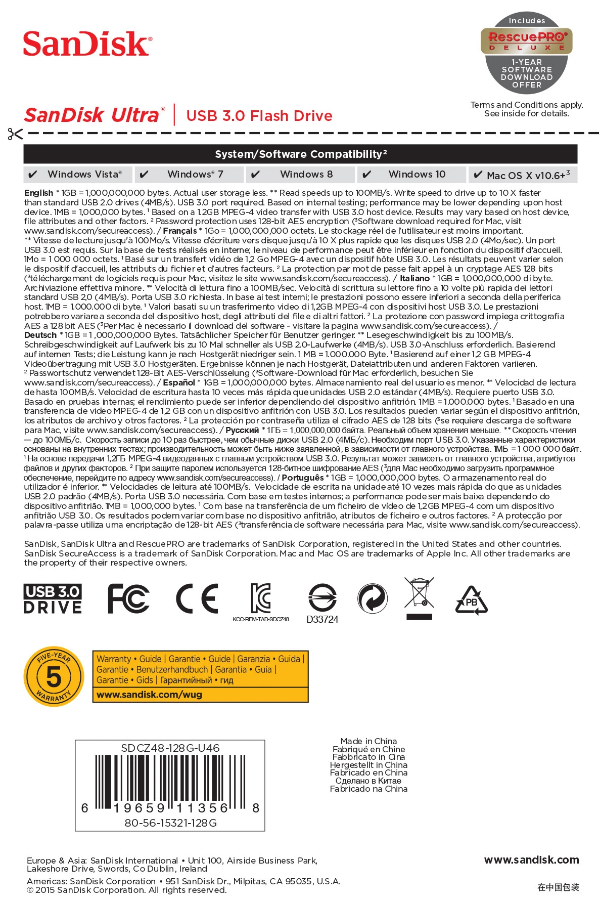 CONSENTE DI TRASFERIRE UN INTERO FILM IN MENO DI 40 SECONDI L’unità flash USB 3.0 SanDisk Ultra combina velocità di trasferimento superiori e ampia capacità di archiviazione in un prodotto compatto ed elegante. Spendi meno tempo attendendo e trasferisci file sull’unità a velocità 10 volte superiore a quelle di un’unità USB 2.0 standard. Con capacità di archiviazione fino a 256 GB, questa unità è adatta per i più voluminosi file multimediali e documenti. SPOSTA I FILE VELOCEMENTE CON VELOCITÀ DI TRASFERIMENTO SUPERIORI Con velocità di trasferimento fino a 100 MB/s, l’unità flash USB 3.0 SanDisk Ultra riduce il tuo tempo di attesa mentre i file vengono trasferiti dall’unità al computer. Compatibile con USB 3.0, questa unità consente di trasferire e memorizzare file a velocità fino a 10 volte superiore a quella delle unità USB 2.0.2 UNITÀ AD ALTA CAPACITÀ PER L’ARCHIVIAZIONE DI FILE DI GRANDI DIMENSIONI Offerta con una gamma di capacità sino a 256 GB, l’unità flash USB 3.0 SanDisk Ultra può archiviare tutti i tuoi file multimediali preferiti e documenti importanti, compresi foto ad alta risoluzione, musica MP3, film, presentazioni e file grafici. PORTATILE ED ELEGANTE Con il suo raffinato design caratterizzato da un’attraente finitura nera, l’unità flash USB 3.0 SanDisk Ultra è sia elegante che pratica. Compatta, portatile, è facile da portare con te in una tasca o nella borsa. IL SOFTWARE SANDISK SECUREACCESS™ MANTIENE I FILE PRIVATI l’unità flash USB 3.0 SanDisk Ultra include il software SanDisk SecureAccess, che consente di creare nell’unità una cartella privata protetta con password. I tuoi file saranno protetti con la crittografia AES a 128 bit per rimanere riservati, anche quando condividi l’unità con altri. GARANZIA L’unità flash USB 3.0 SanDisk Ultra viene offerta con una garanzia limitata di cinque anni.
