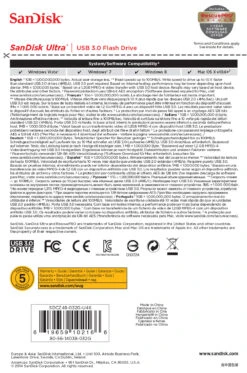 CONSENTE DI TRASFERIRE UN INTERO FILM IN MENO DI 40 SECONDI L’unità flash USB 3.0 SanDisk Ultra combina velocità di trasferimento superiori e ampia capacità di archiviazione in un prodotto compatto ed elegante. Spendi meno tempo attendendo e trasferisci file sull’unità a velocità 10 volte superiore a quelle di un’unità USB 2.0 standard.2 Con capacità di archiviazione fino a 256 GB, questa unità è adatta per i più voluminosi file multimediali e documenti. SPOSTA I FILE VELOCEMENTE CON VELOCITÀ DI TRASFERIMENTO SUPERIORI Con velocità di trasferimento fino a 100 MB/s, l’unità flash USB 3.0 SanDisk Ultra riduce il tuo tempo di attesa mentre i file vengono trasferiti dall’unità al computer. Compatibile con USB 3.0, questa unità consente di trasferire e memorizzare file a velocità fino a 10 volte superiore a quella delle unità USB 2.0. UNITÀ AD ALTA CAPACITÀ PER L’ARCHIVIAZIONE DI FILE DI GRANDI DIMENSIONI Offerta con una gamma di capacità sino a 256 GB, l’unità flash USB 3.0 SanDisk Ultra può archiviare tutti i tuoi file multimediali preferiti e documenti importanti, compresi foto ad alta risoluzione, musica MP3, film, presentazioni e file grafici. PORTATILE ED ELEGANTE Con il suo raffinato design caratterizzato da un’attraente finitura nera, l’unità flash USB 3.0 SanDisk Ultra è sia elegante che pratica. Compatta, portatile, è facile da portare con te in una tasca o nella borsa. IL SOFTWARE SANDISK SECUREACCESS™ MANTIENE I FILE PRIVATI l’unità flash USB 3.0 SanDisk Ultra include il software SanDisk SecureAccess, che consente di creare nell’unità una cartella privata protetta con password. I tuoi file saranno protetti con la crittografia AES a 128 bit per rimanere riservati, anche quando condividi l’unità con altri. GARANZIA L’unità flash USB 3.0 SanDisk Ultra viene offerta con una garanzia limitata di cinque anni.