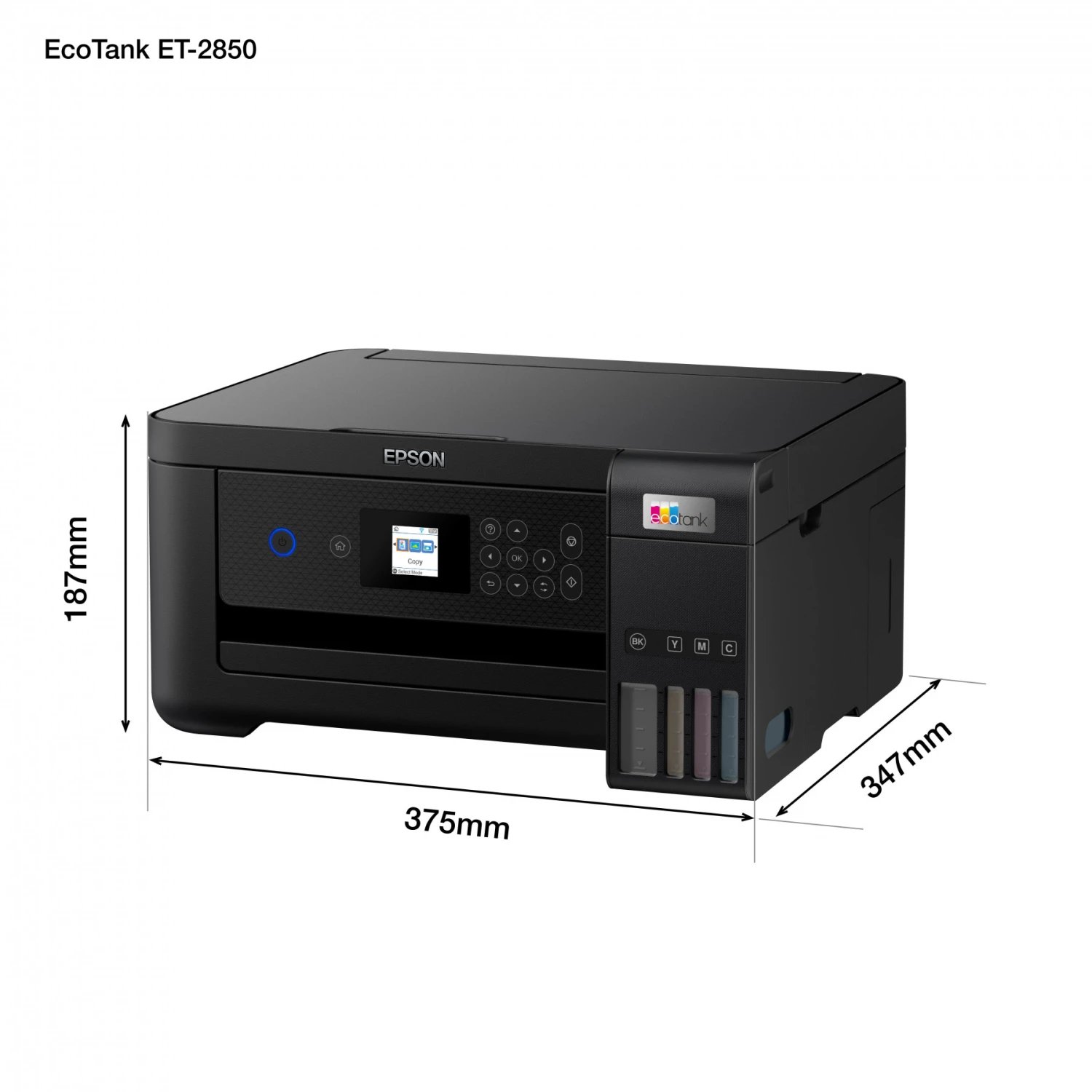 Epson EcoTank ET-2850. Tecnologia di stampa: Ad inchiostro, Stampa: Stampa a colori, Risoluzione massima: 5760 x 1440 DPI, Velocità di stampa (colore, qualità normale, A4/US Letter): 15 ppm. Copia: Copia a colori. Scansione: Scansione a colori, Risoluzione di scansione ottica: 1200 x 2400 DPI. Funzione duplex: Copia, Stampa, Scansione. Massimo formato carta serie ISO A: A4. Wi-Fi. Colore del prodotto: Nero
