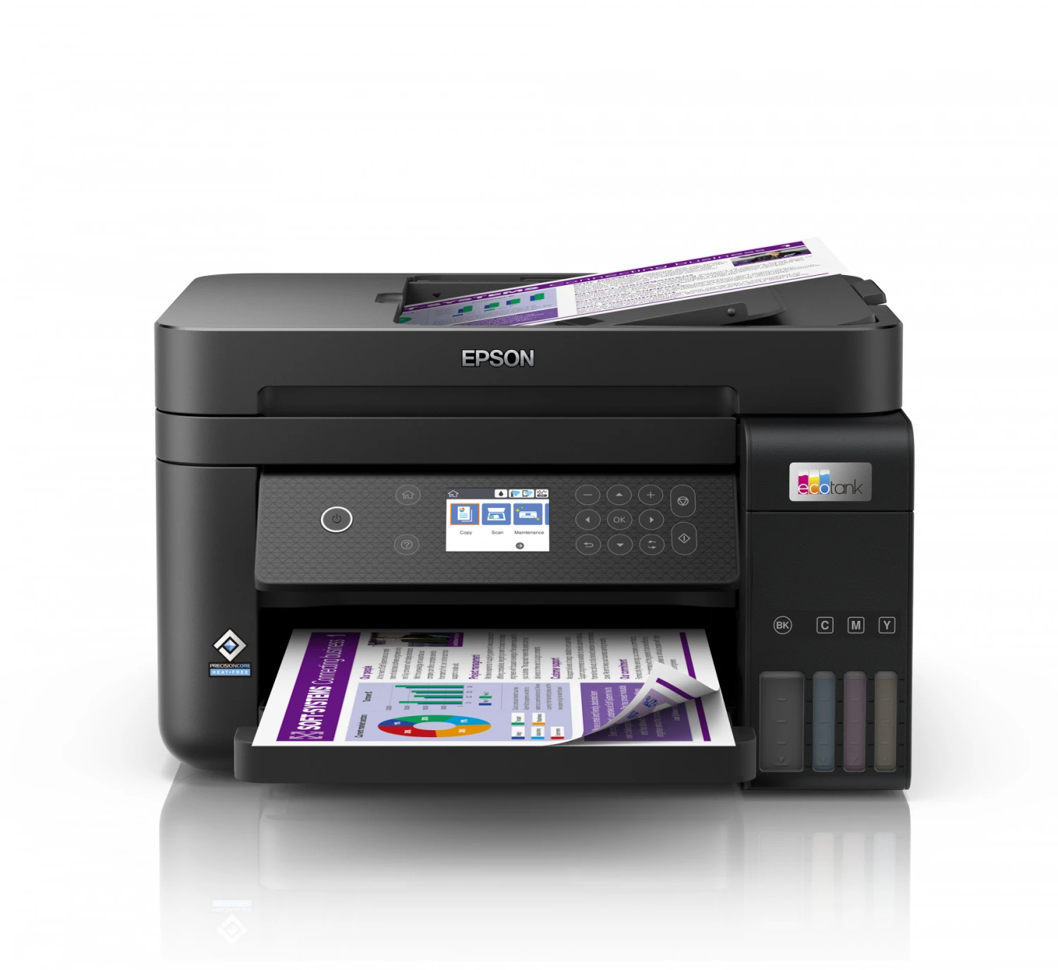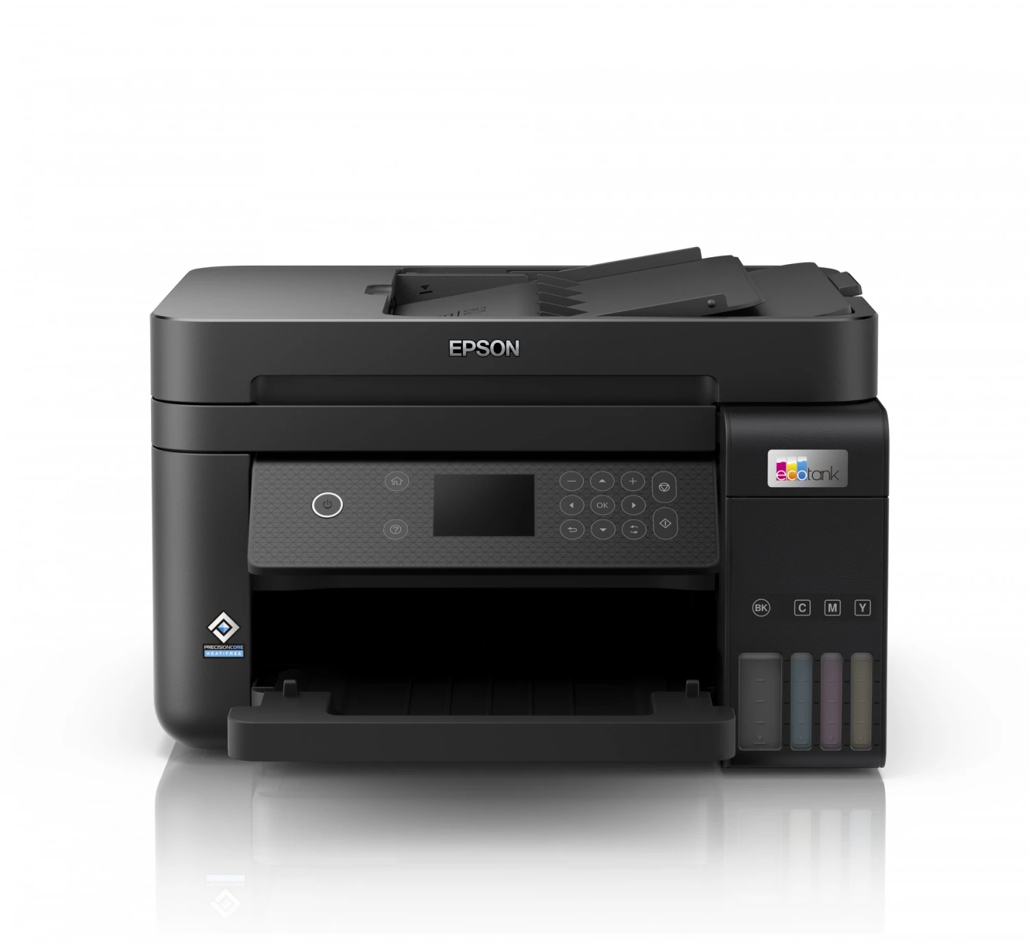 Bye bye cartucce EcoTank offre una pratica soluzione di stampa per uso domestico e nei piccoli uffici: i serbatoi ad altissima capacità sono progettati per ricariche senza fuoriuscite di inchiostro, mentre i flaconi consentono il riempimento solo con il colore corretto. Risparmio sui costi Questa stampante ultraconveniente ti consente di risparmiare fino al 90% sui costi di stampa1. Inoltre, la confezione include un flacone di inchiostro nero extra per un quantitativo sufficiente per 3 anni2. Un unico set di flaconi di inchiostro consente di stampare fino a 7.500 pagine in bianco e nero e fino a 6.000 pagine a colori3, l’equivalente di un massimo di 72 cartucce di inchiostro.1 App Epson Smart Panel Questa app consente di controllare la stampante dal tuo dispositivo intelligente4. Puoi stampare, copiare e acquisire documenti e foto, nonché configurare, monitorare e risolvere i problemi della stampante, tutto dal tuo telefono o tablet. Il pieno di funzionalità Dotata di display LCD a colori da 6,1 cm, stampa fronte/retro automatica e alimentatore automatico di documenti da 30 pagine, vassoio carta a caricamento frontale da 250 fogli e velocità di stampa fino a 15,5 pagine al minuto5, per completare facilmente tantissime attività . Flessibilità al passo coi tempi Grazie al design compatto e alla connettività Wi-Fi, Wi-Fi Direct ed Ethernet completa, puoi integrare facilmente questa stampante nella configurazione domestica o dell’ufficio esistente e stampare da cellulari, tablet e laptop4. Tecnologia a freddo Grazie alla tecnologia a freddo PrecisionCore, potrai apprezzare i vantaggi di un consumo energetico notevolmente ridotto e meno ricambi da sostituire. Anche la testina di stampa è preinstallata, per un processo di configurazione della stampante davvero semplice.