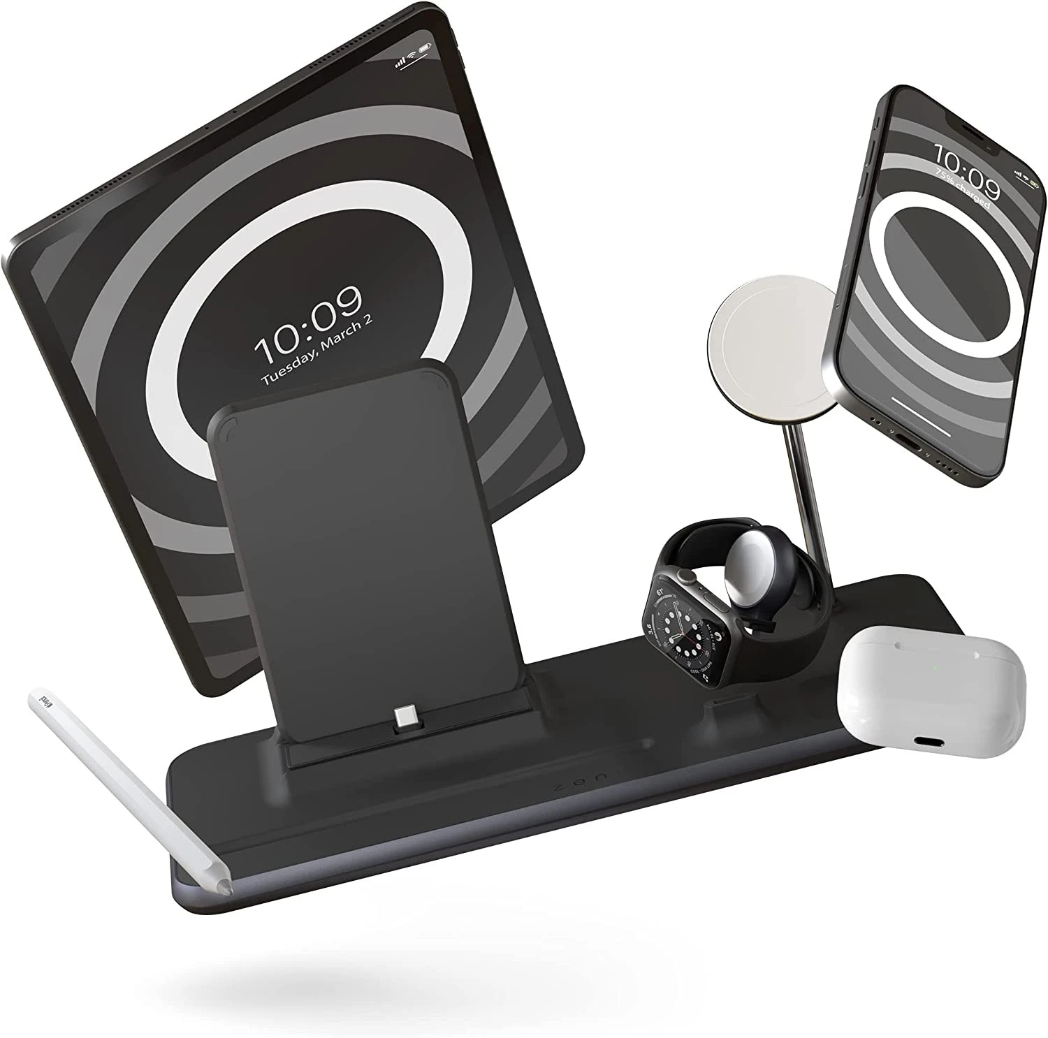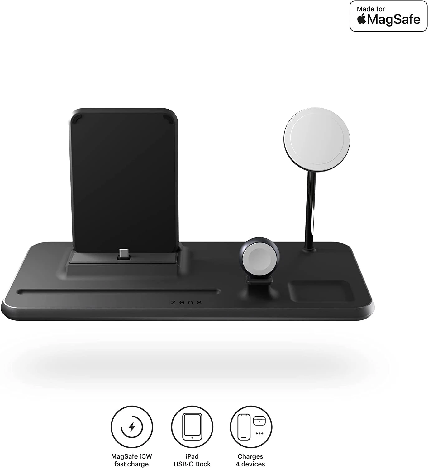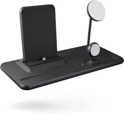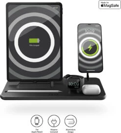 Il caricabatterie 4 in 1 presenta un’uscita wireless magnetica da 15 W, un caricabatterie wireless da 5 W per iPod, una porta USB-A integrata per un Apple Watch Stick (incluso), un adattatore CA/CC e una porta USB-C con supporto per iPad (Pro). Perfetto per la scrivania, in modo da non perdere nessuna chiamata o notifica.